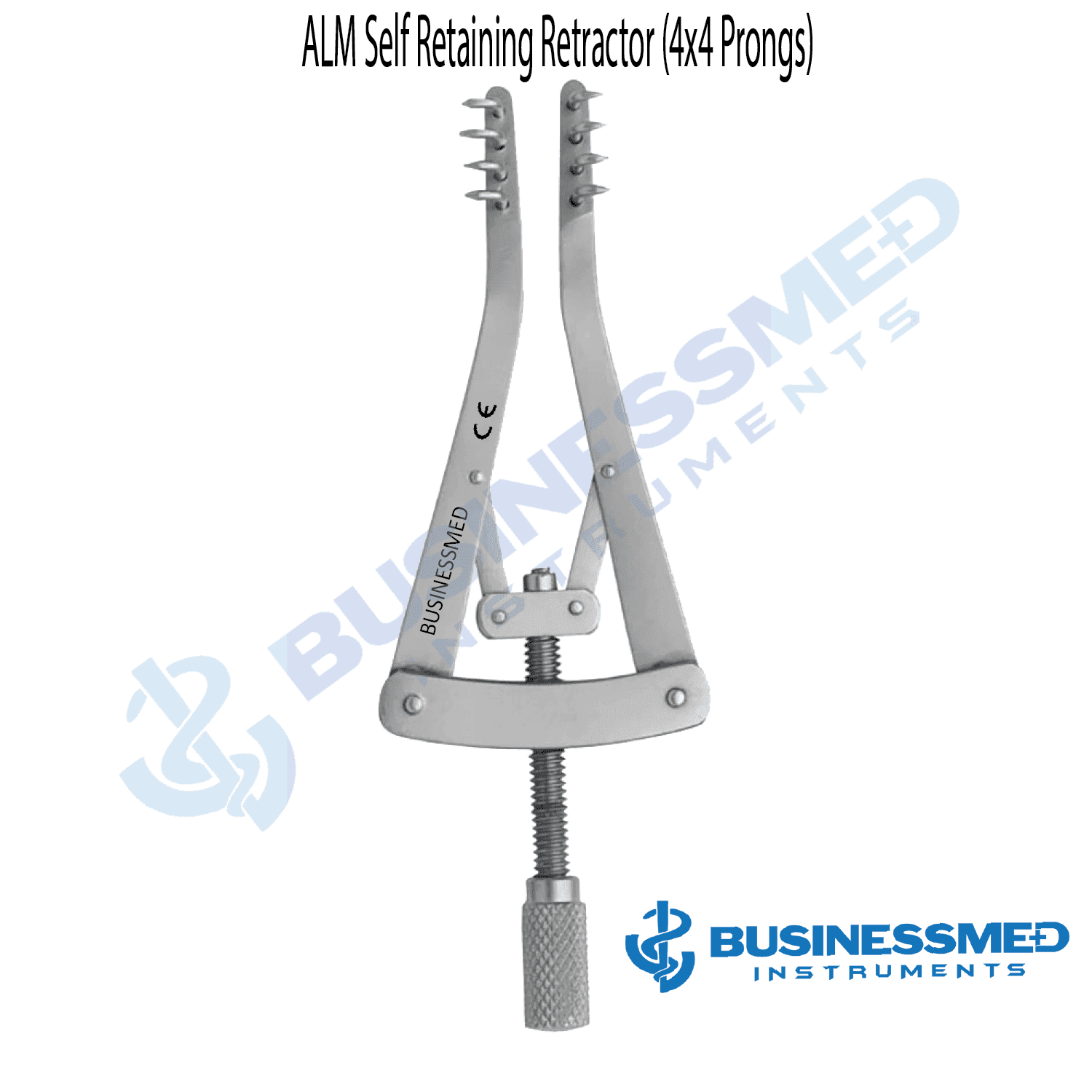 BusinessMed Instruments continues advancing their instrument technology with their latest ALM Self Retaining Retractor (4×4 Prongs). This innovative device allows surgeons to precisely retract delicate tissues deep within the body for a wide variety of general procedures. The ALM Retractor’s four stainless steel prongs are selectively fitted with either blunt or sharp tips optimized for different tissues. A uniquely engineered locking mechanism enables it to securely maintain its position without further assistance from operating staff. Crafted from top-grade German alloys and backed by BusinessMed’s standard one year warranty, the ALM Retractor empowers surgeons with improved control and visibility in even the most confined surgical sites.